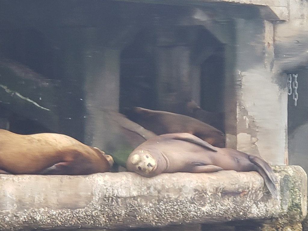 The surrounding area was covered in seals. Seals were everywhere humans weren’t, resting on the lower docks, the rocky sea barrier, and welcomed us with a choir of barks and squeals. They were fascinating to watch as we made our way out to sea. After leaving the dock area, we made our way into whale territory, where the whales breached the water during their migration. The boats cautiously circled the busy waters, getting close enough for great pictures, but not close enough to hurt the whales.